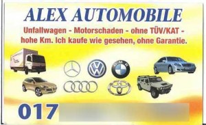 Wom­it man, wenn man den unter dem Scheiben­wis­ch­er manch­er Autos zu find­en­den Vis­itenkarten trauen darf, übri­gens auch ein gewiss­es Ver­mö­gen anhäufen kann, ist das Han­deln mit kaput­ten Fahrzeu­gen, Motorschaden inklu­sive: