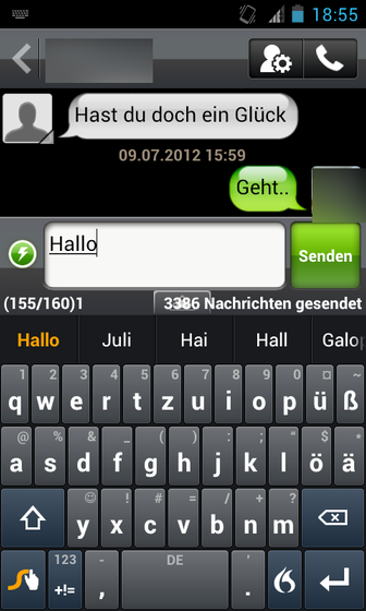 Sieht aber eben nur so aus: Swype basiert auf dem Prinzip des “Wischens”. Möchte man etwa “Hallo” tippen, tippt man auf das “H”, belässt den Finger auf der Tastatur und wischt zu “a”, “l” und “o”. Groß- und Kleinschreibung beachtet Swype hierbei ebenso wie Mehrfachbuchstaben; bei Mehrdeutigkeiten (Halo — Hallo) kann man auch das “l”, etwa durch Kreisen, mehrfach übermitteln, um einen weiteren Schritt zu ersparen. Im Gegensatz zu SwiftKey rät Swype nicht, welches Wort als nächstes gewünscht werden könnte, jedoch, welches Wort man gerade tippen wollte. Je präziser die Erkennung eingestellt ist, desto präziser muss man zwar “wischen”, aber desto genauer ist auch die Erkennung.