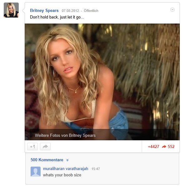 Techblogger caschy berichtete gestern darüber, dass Google+ nunmehr “sprechende” URLs für Benutzerprofile einzuführen beginnt. Dort erfuhr ich, dass entgegen meiner Annahme, außer Sascha Lobo sei niemand mehr auf Google+, offenbar auch Britney Spears dort ihr Unwesen treibt.