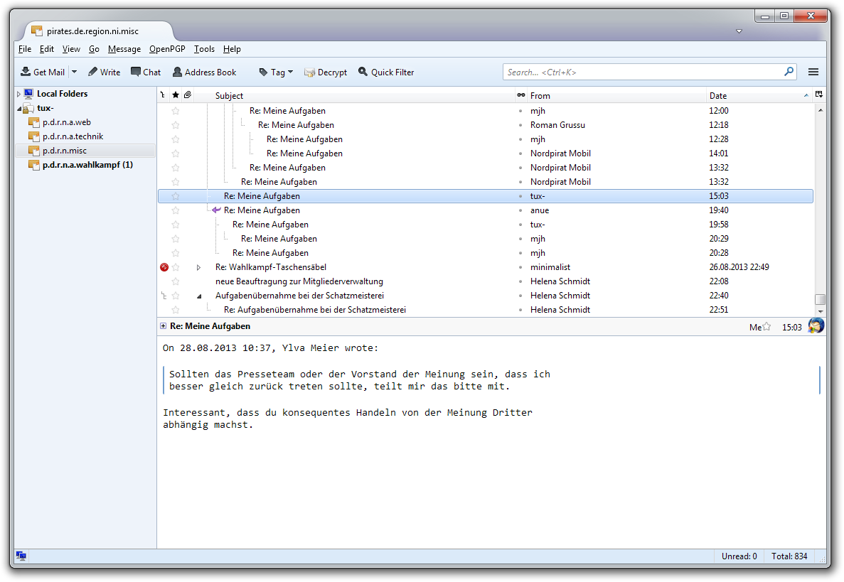 Das ist natür­lich alles schön bunt und prak­tisch (wenn man sich die Tas­tenkürzel, etwa K zum Ignori­eren von Threads, merken kann), hat aber den nicht zu unter­schätzen­den Nachteil, dass die Entwick­lung von Thun­der­bird stag­niert, die Zukun­ft des Pro­gramms ist weit­er­hin ungewiss. Ein Umstieg bietet sich an — aber an brauch­baren Alter­na­tiv­en scheint es zu man­geln. Vielle­icht sind meine Ansprüche (GnuPG-Unter­stützung und Bau­man­sicht für Diskus­sio­nen) tat­säch­lich zu hoch. Fol­gende (wenige) Alter­na­tiv­en, die meinen Ansprüchen genü­gen, sind allerd­ings alle­samt freie Soft­ware und unter mehreren Plat­tfor­men (inklu­sive FreeB­SD und Win­dows) lauf­fähig.