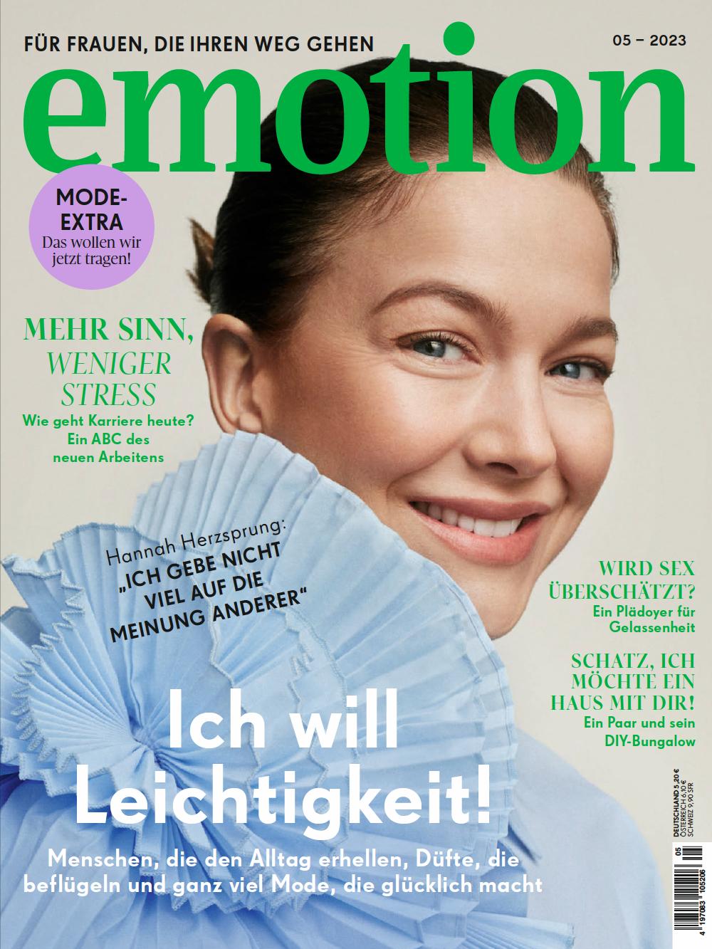 Was kann nach so viel Emotion noch kommen? Natürlich die “emotion”, das Heftlein “für Frauen, die ihren Weg gehen” (oder halt “Ihren”, das ist so der Nachteil an dem allgegenwärtigen Schriftgebrüll), die einerseits offenbar Stress mit der “Cosmopolitan” will, indem sie die Titelseitenredaktion “Wird Sex überschätzt?” fragen und “Düfte, die beflügeln” ankündigen lässt, andererseits jedoch Hannah Herzsprung, offenbar die abgebildete Frau, mit den Worten zitiert, sie “gebe nicht viel auf die Meinung anderer”. Hannah Herzsprung wäre ein weniger dankbarer Kunde der “emotion”-Redaktion als ich. Ich mache ja hier sogar indirekt Werbung für den Kram.