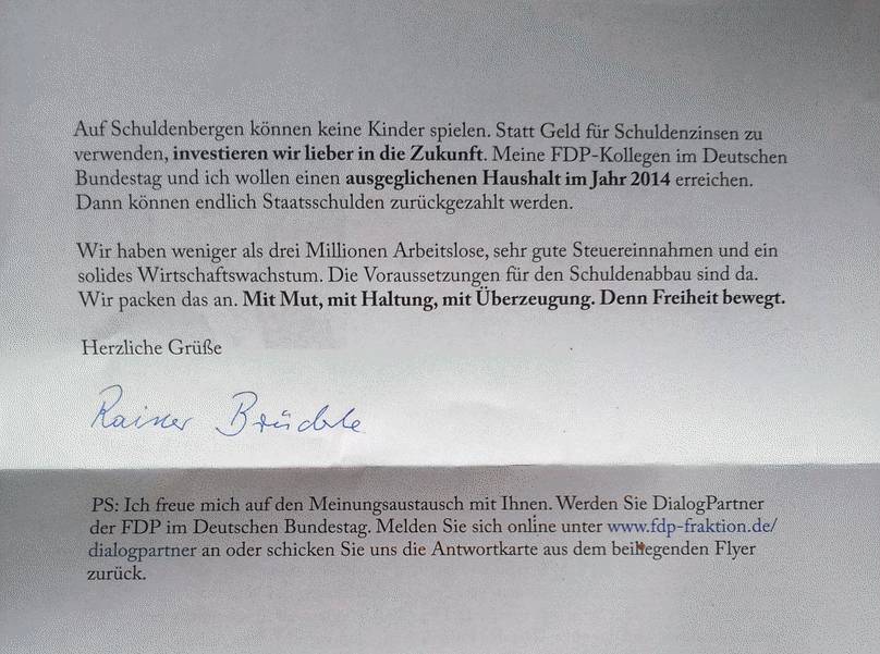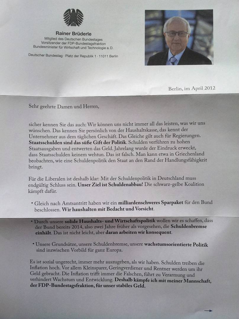 Gegenwärtig werden verschiedene Haushalte in Deutschland mit Werbeprospekten der F.D.P. beglückt, begleitet von einem persönlichen Anschreiben von Rainer Brüderle, dem Vorsitzenden der erstaunlich langlebigen F.D.P.-Bundestagsfraktion, in dem er hervorhebt, wie nützlich die F.D.P. in den vergangenen Jahren war. (Parallelen zu Erich Mielkes ungefährem “Aber ich liebe doch alle Menschen!” in ähnlicher Situation wie der, in der sich die F.D.P. momentan befindet, sind sicher nur Zufall.)