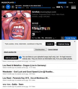 Was diesen Diensten jedoch meist fehlt, ist eine brauchbare Wiedergabelistenverwaltung, wie YouTube sie hat. Hier kommt der Dienst musicplayr (wer braucht schon Vokale?) ins Spiel, den ich vor einer Weile auf schallgrenzen.de gefunden habe und der Lieder von zahlreichen Quellen — zurzeit YouTube, Vimeo, Dailymotion, Soundcloud und diverse Musikblogs — in beliebig vielen Wiedergabelisten organisieren kann. Was an Liedern nirgends im Internet gefunden werden kann, kann auch einfach — wie bei Grooveshark — hochgeladen werden, ist allerdings dann zwar in der eigenen Wiedergabeliste für jeden sicht‑, jedoch aus rechtlichen Gründen nicht verfügbar. Lieder, die man selbst hochlädt, kann man auch nur selbst hören.