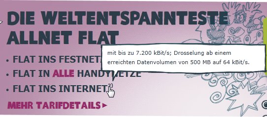“Unbegrenzt ins Internet”, bis zur nächsten Grenze halt — Bürger der “ehemaligen” DDR kennen dieses Verständnis von “unbegrenzter” Freiheit eventuell noch von früher. Der angebotene Internetzugang also ist weder kostenlos noch unbegrenzt. (Möge ein gelangweilter Jurist alsbald ein wenig Zubrot oder auch einen Zumercedes mit der Beschäftigung mit der Frage verdienen, ob aus kommerziellem Interesse heraus massenhaft in die Wohnzimmer getrötete Unwahrheiten nicht eine allzu einfache Zielscheibe bieten.)