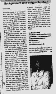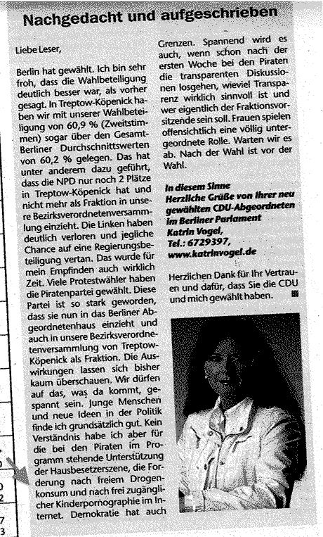 Der Preis für größtmöglichen Realitätsabstand geht in diesem Monat traditionell wieder an die CDU, diesmal an das dortige Mitglied Katrin Vogel, die irgendjemand blöd genug war zu wählen und die deshalb folgenden Unsinn unredigiert in irgendein — zum Glück nur lokales — Quatschblatt drucken lassen durfte: