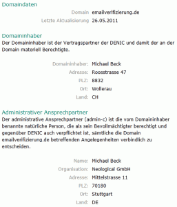 Es zeichnet keine Frau E‑Mail Verifizierung verantwortlich, sondern ein Herr Michael Beck (vermutlich nicht identisch mit Michael “Dee Jot Hausmarke” Beck), der trotz des Firmensitzes in Bremen in Stuttgart und/oder der Schweiz wohnt. Ich kann mir also zumindest schon mal sicher sein, dass es sich um keinen russischen Spambot handelt, sondern schlimmstenfalls um einen der Schizophrenie anheim gefallenen Geschäftsmann (oder drei Leute, die an völlig unterschiedlichen Orten wohnen, aber zufällig identisch heißen), denn die DENIC ist eigentlich bisher nicht dafür bekannt, beliebige Daten zu akzeptieren, die jeder wie auch immer gearteten Grundlage entbehren.