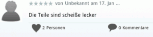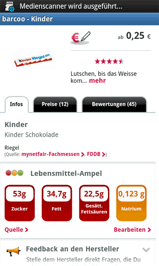 barcoo ist somit sozusagen ein mobiler Preisvergleich und ein umfangreicher Produktkatalog in einem. Keinesfalls beschränkt sich die Funktionalität dabei auf Lebensmittel, Computerzubehör wird ebenso erkannt wie Bücher und vermutlich jedes andere Produkt, das in einem Haushalt so herumliegt. Die angezeigte “Lebensmittelampel” ist dann natürlich hinfällig. Überdies können Benutzer der app das jeweilige Produkt bewerten, und mitunter ist es erfreulich zu sehen, dass offenbar keinerlei Moderation dieser Kommentare erfolgt …