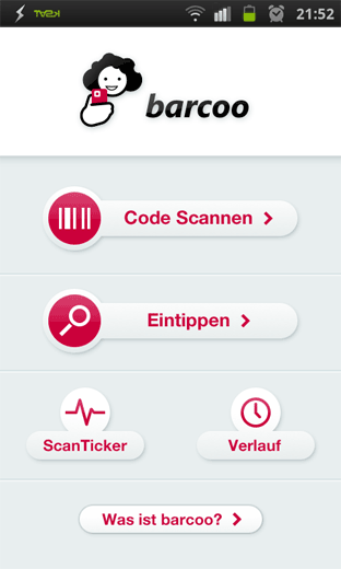 Nach der Installation — für jedes unterstützte Gerät gibt es eine eigene Version zum Download, selbst für iPhones und anderen Schrott — lässt barcoo keine Fragen offen, was es kann und wie es geht: