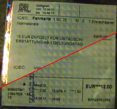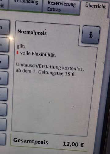 “Ich habe hier am Automaten diese Fahrkarte für 12 Euro gekauft, kann die Fahrt aber leider nicht mehr antreten, und sie war zu teuer, um sie verfallen zu lassen, darum bitte ich um Erstattung.”