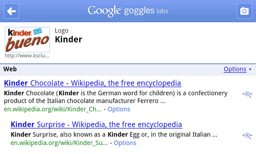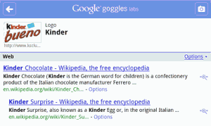 Die Bedienoberfläche von Goggles ist noch etwas aufgeräumter als die von barcoo, denn es gibt keine, hat man erst einmal das anfängliche “Weiter — Weiter — … — Fertig” hinter sich gebracht: Der Benutzer sieht nur mehr das Kamerabild und zwei Schaltflächen zum Fokussieren und “Fertigstellen” des Bildes. Obwohl Goggles mit dem Erkennen des Bildmotivs grundsätzlich mehr Schwierigkeiten zu haben scheint als barcoo, ist die vielseitige Erkennung doch schon recht ausgereift, bedenkt man, dass Goggles nicht auf eindeutige Informationen wie Barcodes, sondern vor allem darauf angewiesen ist, dass es in seiner großen Datenbank — ich vermute die Google-Suche als technischen Hintergrund — ähnliche Bilder findet: